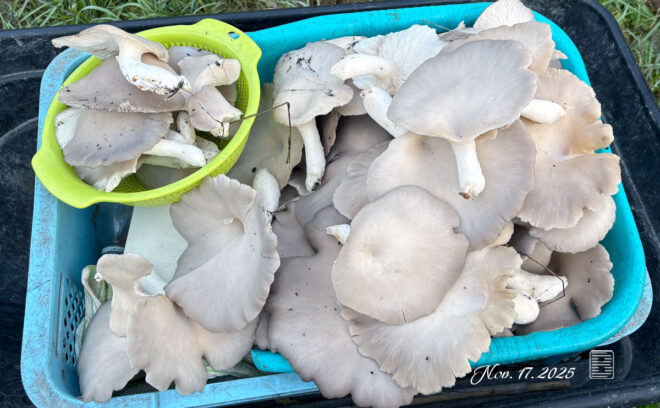 大きく開いたヒラタケがどっさり。サイズは手のひらサイズより大きいものまで。